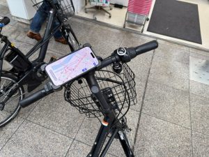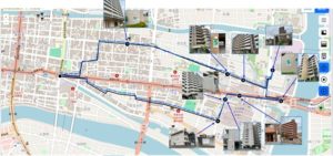 私たちは、この計算結果を基に、11月12日に実際に高知市内で経路の確認を行いました。実証実験当日はもちろん津波浸水が発生していないため、乾いた道路上を、自転車を用いて導出された経路に沿って避難タワーを巡回し、評価を行いました(図3)。