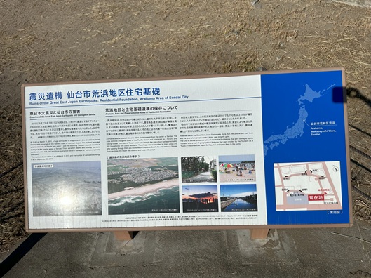 宮城県3.11津波災害記念館と同様、荒浜小学校の敷地もカムチャッカ津波警報のため、私たちの訪問中は一時的に閉鎖されていた。この対応は、日本の津波警報システムが実際にどのように運用されているのか、浸水の可能性がある区域にある記念館であっても公共の安全を優先していることを端的に示す例となった。 その代わりに、私たちは東日本大震災の廃墟を見た:写真の仙台市荒浜地区住宅基礎。