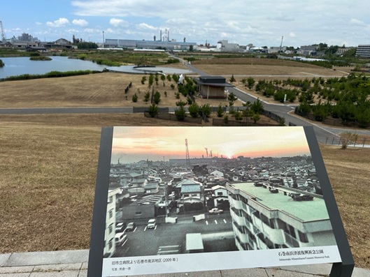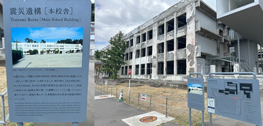 私たちは、「石巻市立門脇小学校跡」 を訪れました。津波とその後の火災による二重の被害を痛感させられた。内部を見ることができる外部通路を歩いたが、火災の被害がまだはっきりと残っていた。この建物は、津波が引き起こした火災の影響を示す、この地域に残る唯一の建物である。本館の隣には屋内運動場があり、津波の力でねじれたり潰れたりした乗り物が展示されていた。最も印象的だったのは、周辺の南浜や門脇地区で500人以上の市民が亡くなった一方で、この学校の生徒と教師は日和山への避難訓練に従って生き延びたということを知ったことだ。この力強い備えの証は、災害時の人命救助において、定期的な避難訓練と地域の地理的知識が極めて重要であることを強調している。