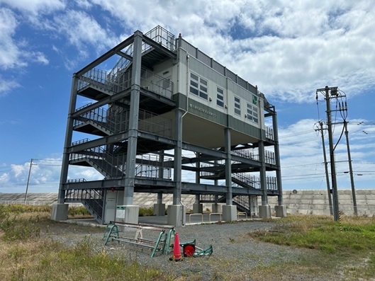 次の目的地へ向かう途中、私たちはいくつかの津波避難タワーを見学した。津波避難タワーは、高台に容易に到達できない地域で垂直避難を行うために設計された重要なインフラである。強力な津波の力にも耐えることができるこれらの構造物は、丘や高台など自然の安全な避難場所が確保できない場合に、工学的な解決策によって人命を救うという自治体の意志を象徴している。