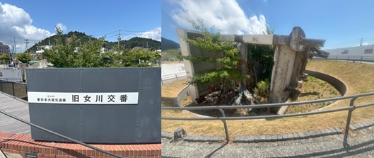 私たちは、2011年の津波で倒壊した鉄筋コンクリート2階建てのねじれた建物「旧女川交番」 を訪れた。その交番の土台は文字通り引き波によって引き抜かれた。このような構造崩壊の例は世界的にも珍しく、研究者としては興味を引くものである。周囲の情報パネルには、震災前、発災直後、復興中の町の様子が記されている。大破した交番のそばに立つと、私は厳粛な敬意を感じるとともに、自然の力がコンクリートさえも無にしてしまうということを強く意識した。震災の記憶は、鉄と石の中に保存されているのだ。